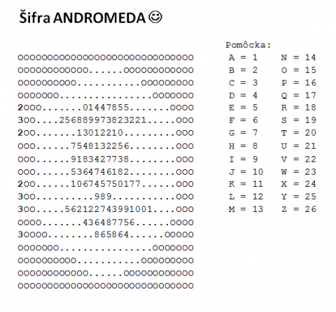 Pre deti sme mali pripravené rôzne aktivity a medzi nimi aj šifry. Tu je jedna z nich. Volá sa ANDROMEDA :)